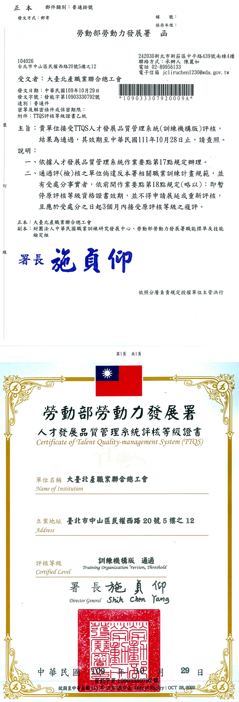 本會109年【TTQS人才發展品質管理系統】評核結果通過