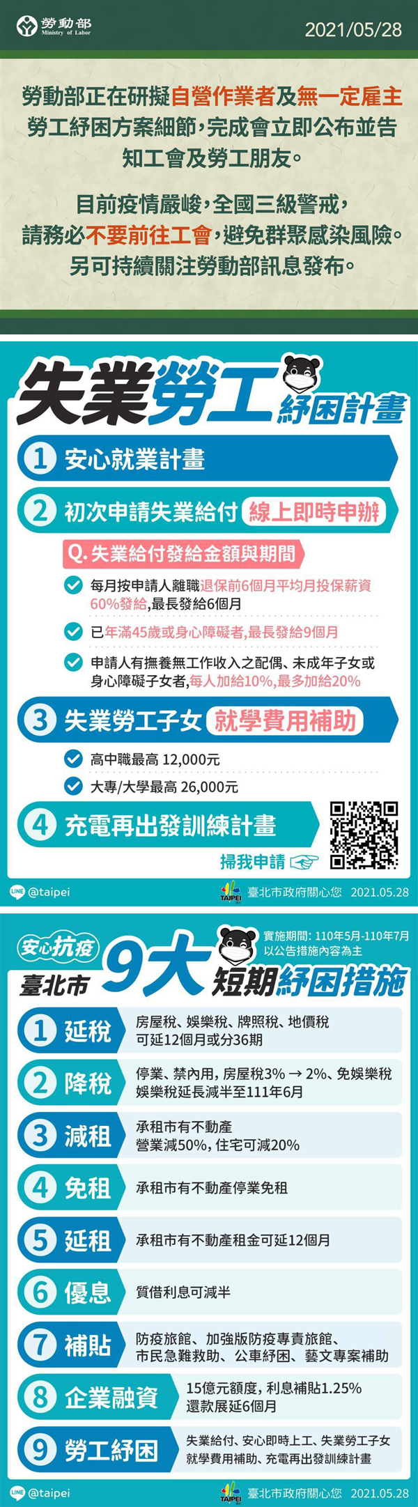 勞動部最後呼籲勞工朋友勿前往職業工會聚集詢問,會有違反防疫規範的可能與危險,該部將盡快完成相關法制作業流程,並透過公告、新聞稿及網路宣導等方式通知適用補貼的勞工,勞工朋友如需查詢因應疫情所需之防疫、紓困及振興相關措施,亦可至行政院建立統合網站「嚴重特殊傳染性肺炎武漢肺炎COVID-19專區」(網址:https://1988.taiwan.gov.tw/),可快速查找所有紓困措施。 |