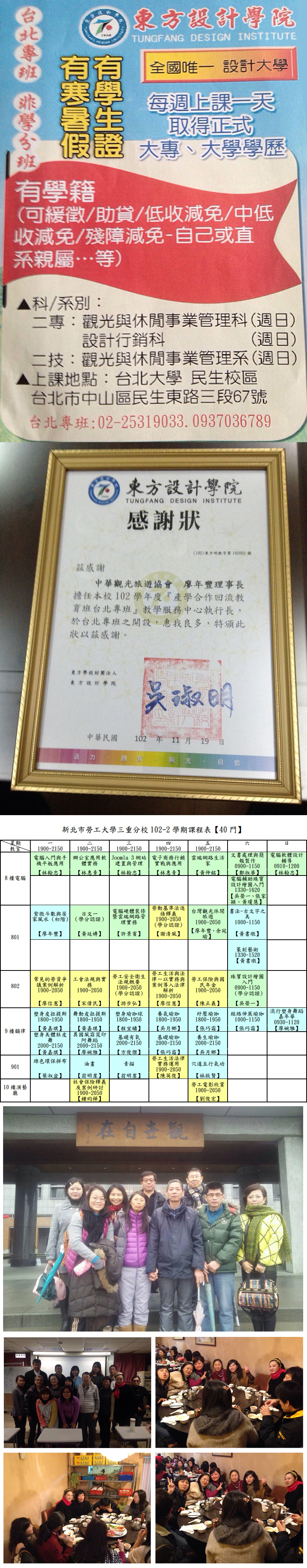 ※ 本會與高雄東方技術學院配合台北專班及二季班 (一)觀光休閒科系 (二)行銷管理含不動產科系 (三)時尚美妝造型科系 上課地點:台北市民生東路台北大學校區 由本會總幹事廖年豐擔任執行長 歡迎在職勞工朋友,每星期日上課一天,有學籍、非學分班,歡迎來電 ※ 本會與新北市勞工大學配合 (一)紫微斗數陽宅規劃班 (二)台灣觀光休閒班 二門課程由本會廖理事長年豐親授 歡迎會員踴躍報名參加(新北市政府有補助)
