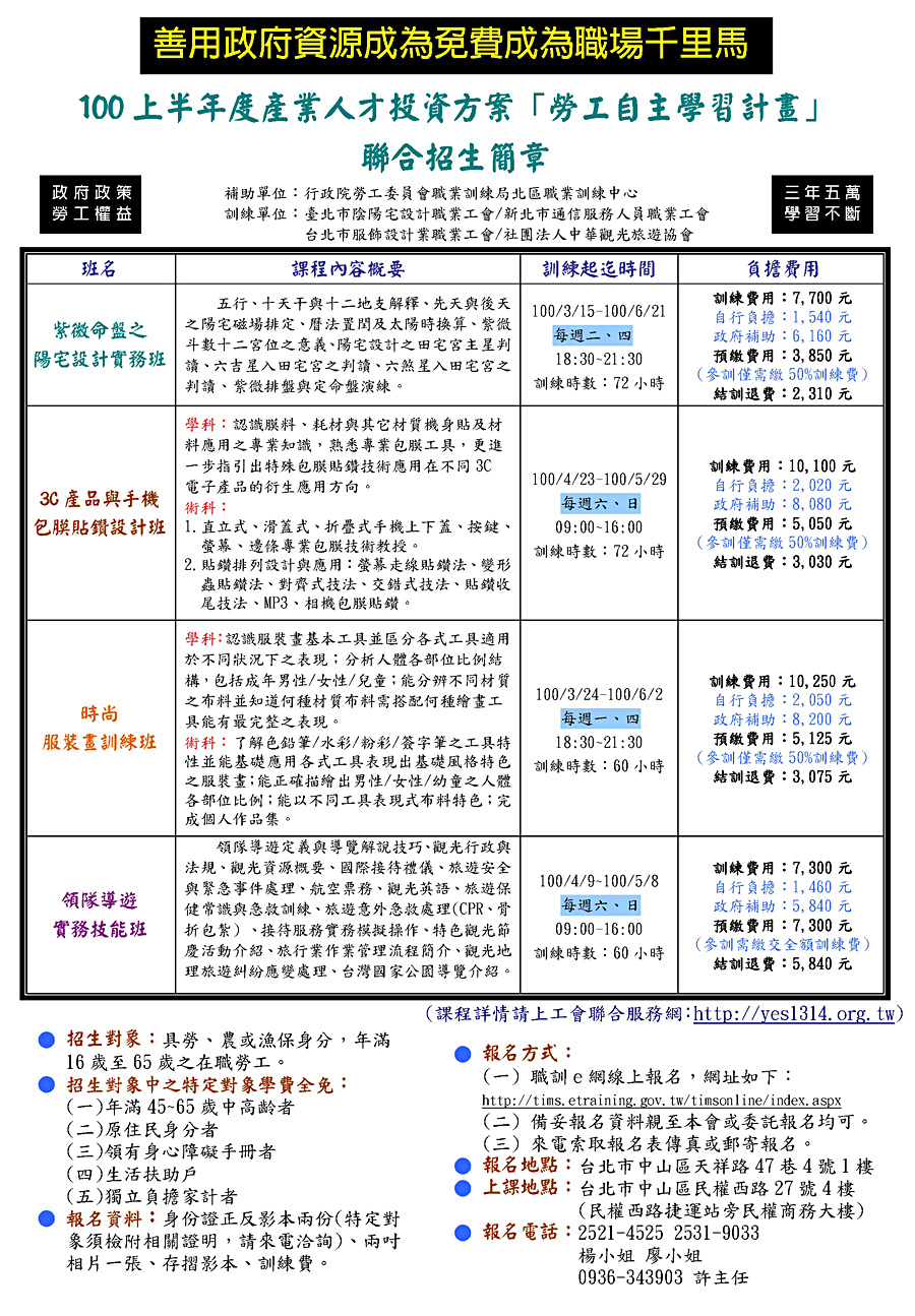 補助單位:行政院勞工委員會職業訓練局北區職業訓練中心 訓練單位:新北市通信服務人員職業工會 開課課程:3C產品與手機包膜貼鑽設計班 開課時間:100/4/23-100/5/29 每週六、日 09:00~16:00 訓練時數:72小時 課程資訊: 學科: 認識膜料、耗材與其它材質機身貼及材 料應用之專業知識,熟悉專業包膜工具,更進 一步指引出特殊包膜貼鑽技術應用在不同3C 電子產品的衍生應用方向。 術科: 1.直立式、滑蓋式、折疊式手機上下蓋、按鍵、螢幕、邊條專業包膜技術教授。 2.貼鑚排列設計與應用:螢幕走線貼鑚法、變形蟲貼鑚法、對齊式技法、交錯式技法、貼鑚收尾技法、MP3、相機包膜貼鑚。 附加檔案內容:100年度教育訓練課程.pdf 3C產品與手機包膜貼鑽班課程表.pdf